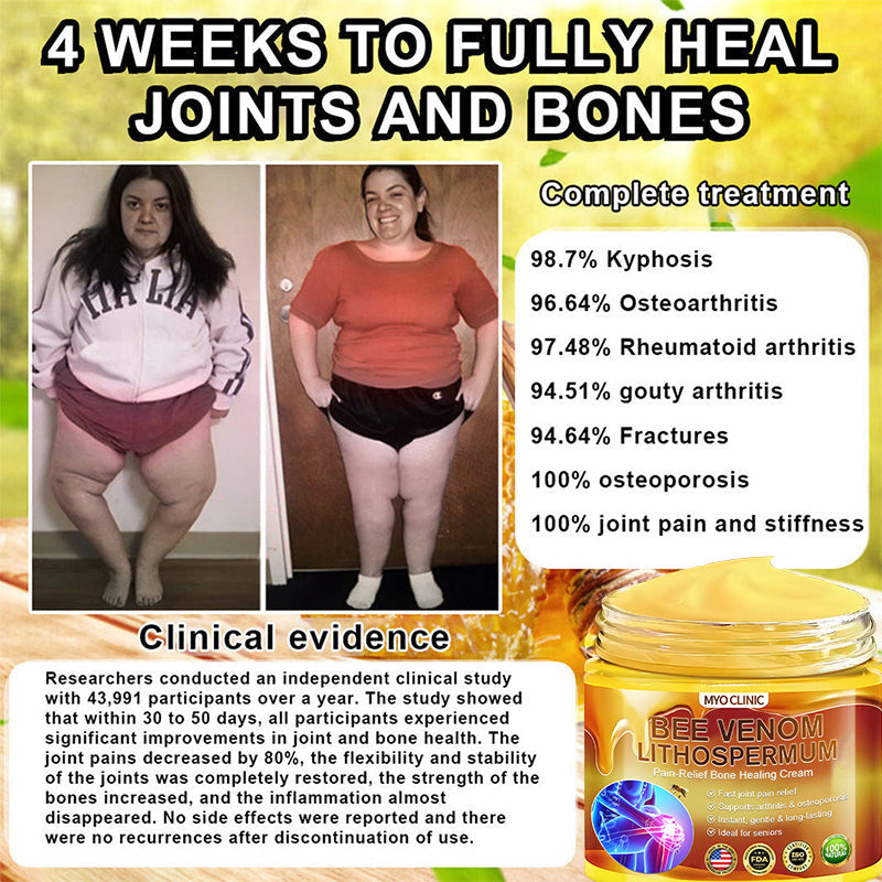 Myo Clinic BEE VENOM LITHOSPERMUM Pain-Relief Bone Healing Cream This product is certified and recommended by FDA, meeting their high standards to effectively relieve pain and promote bone health. Approved by orthopedic doctors, it relieves pain within 5 minutes, restores joint mobility in 7 days, and significantly improves arthritis symptoms in 4 weeks. Choose our BEE VENOM LITHOSPERMUM Pain-Relief Bone Healing Cream and enjoy reliable results and a pleasant experience with confidence.