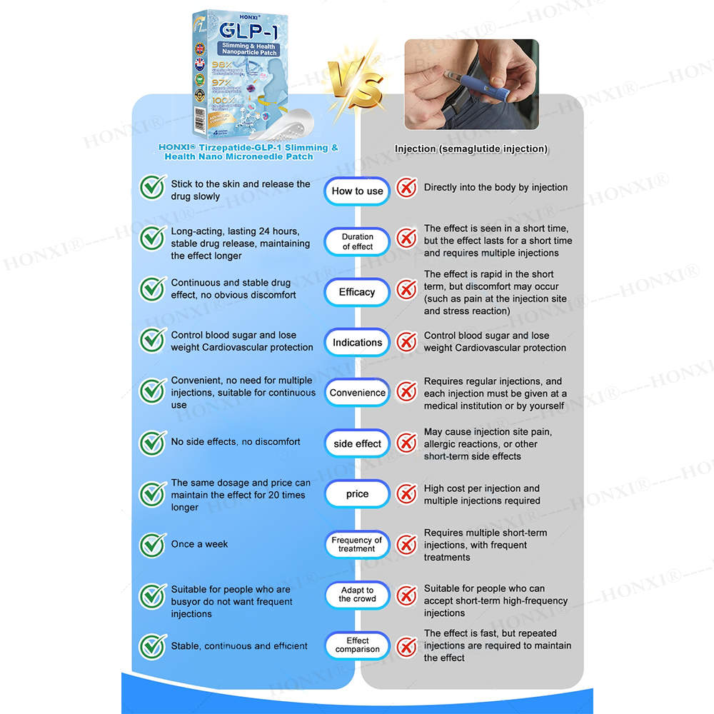 The HONXIĀ® Slimming & Health Nanoparticle PatchĀ offers a long-lasting, slow release of the active ingredients, ensuring a stable effect over 24 hours without causing any discomfort. With the same dosage and price, it can maintain up to 20 times longer-lasting effects (similar to the difference between an IV drip and a single injection).