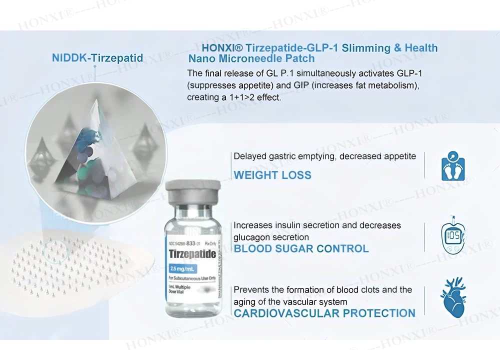 The Nano Microneedle Patch contains šŗššT-š®šš-1 in each patch. It works by mimicking the action of Glucagon-like Peptide-1 (GLP-1), promoting insulin secretion, inhibiting glucagon secretion, and delaying gastric emptying, which helps control blood sugar levels and aids in weight loss.