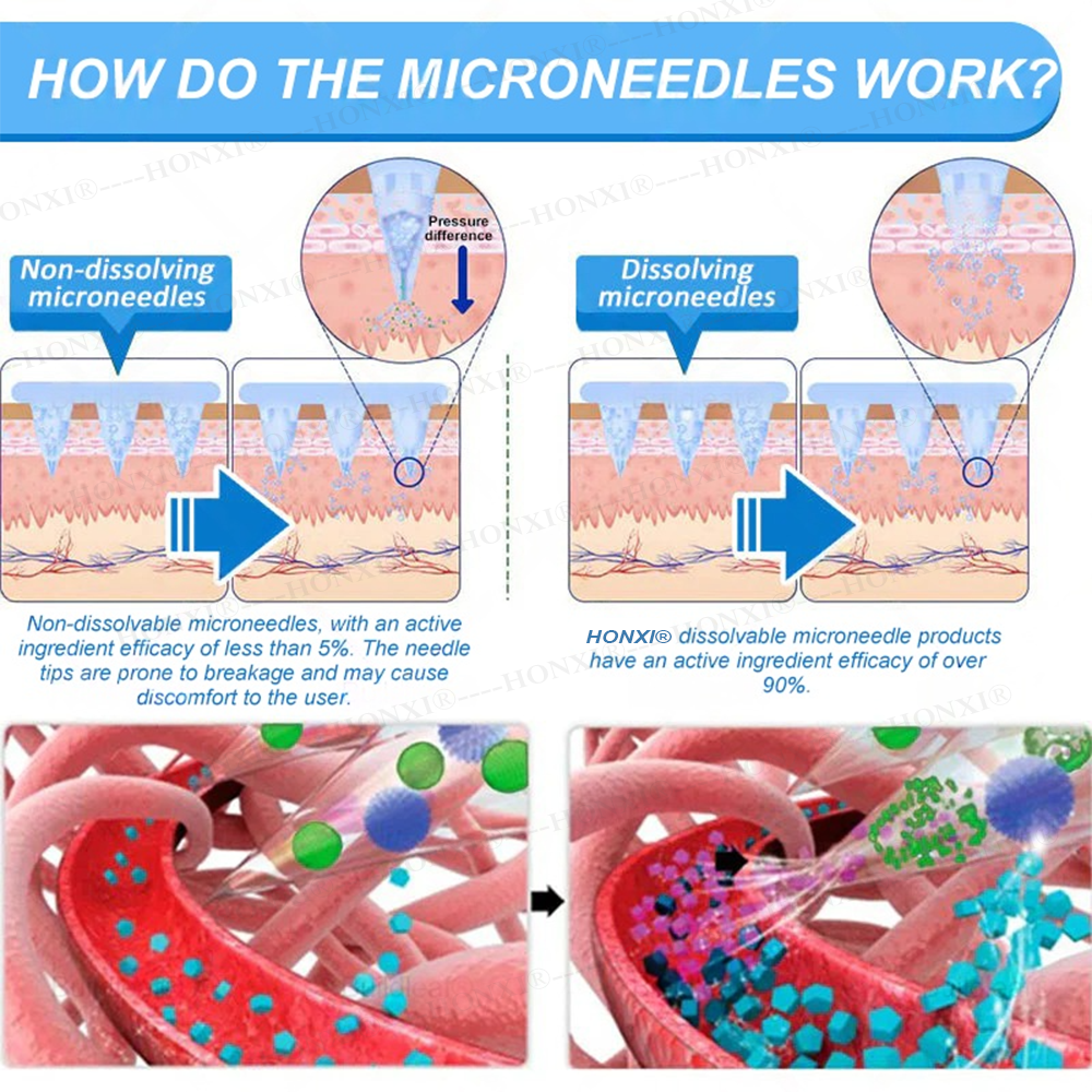 Each needle is 0.27mm long, just 1/7th the thickness of a hair, and is made from dissolvable medication. These micro-needles are precision-engineered using cutting-edge manufacturing techniques to ensure a seamless, pain-free experience while effectively delivering the active ingredients directly into the skin.