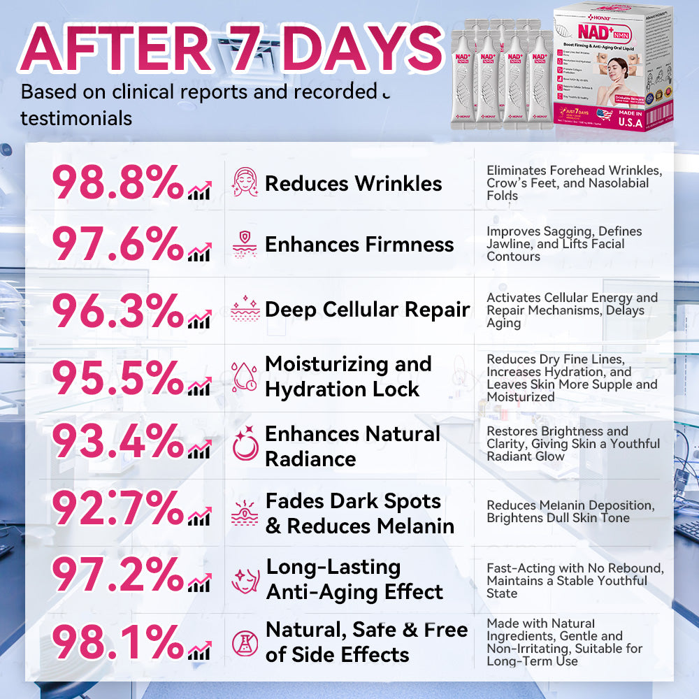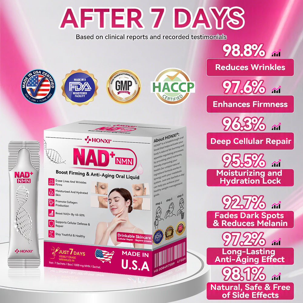 Clinically validated by dermatologists, HONXI® 𝐍𝐌𝐍 𝐍𝐀𝐃+ Boost Firming & Anti-Aging Oral Liquid visibly improves signs of aging—including wrinkles, sagging, and dull complexion—in just 7 days.