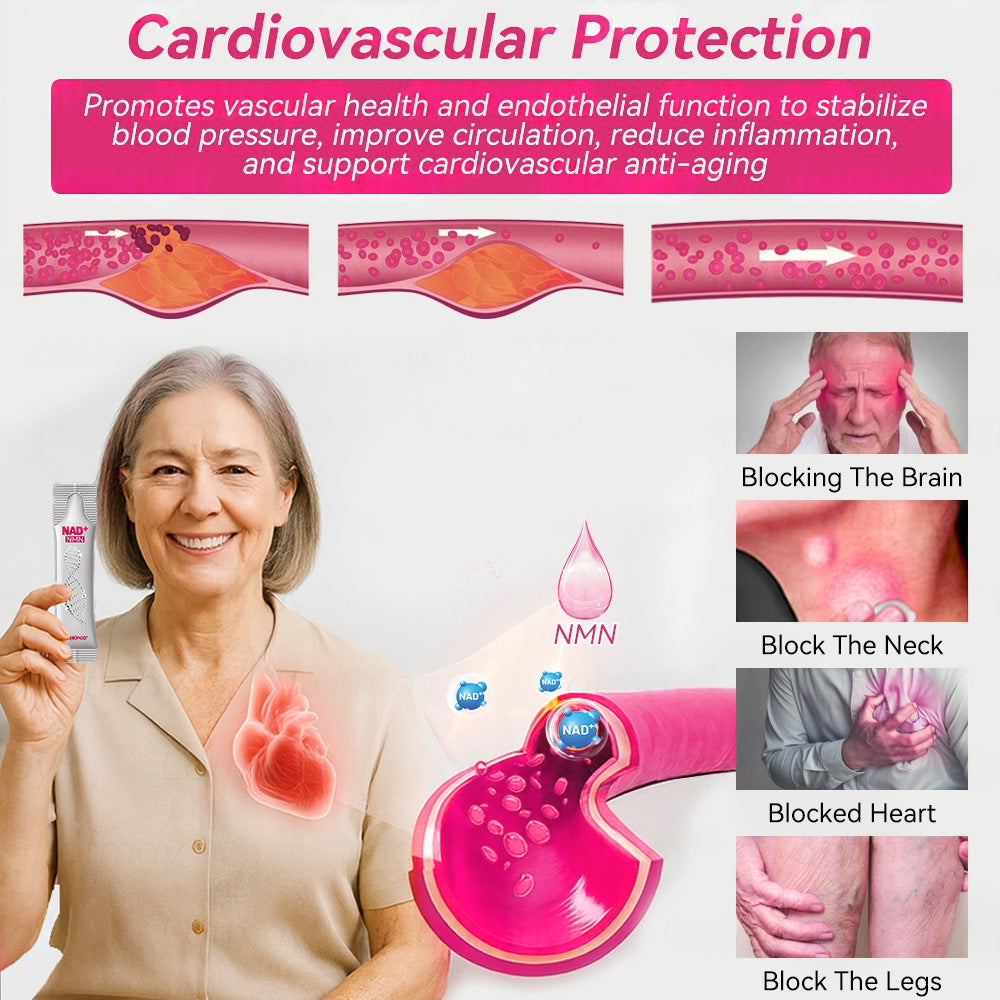 NMN (Nicotinamide Mononucleotide) converts to NAD⁺, improving vascular endothelial function, enhancing cellular energy supply, helping stabilize blood pressure, and boosting vascular elasticity—thereby reducing the risk of atherosclerosis and blockages at their source. CoQ10 (Coenzyme Q10) strengthens myocardial energy metabolism, protects cardiac function, reduces oxidative damage, and promotes healthy circulation. Their synergistic action stabilizes blood pressure, improves circulation, and reduces inflammatory responses, effectively preventing blood flow blockages in the brain, neck, heart, and lower limbs. Long-term use enhances cardiovascular and cerebrovascular function, delays vascular aging, and provides more stable oxygen and nutrient delivery throughout the body.
